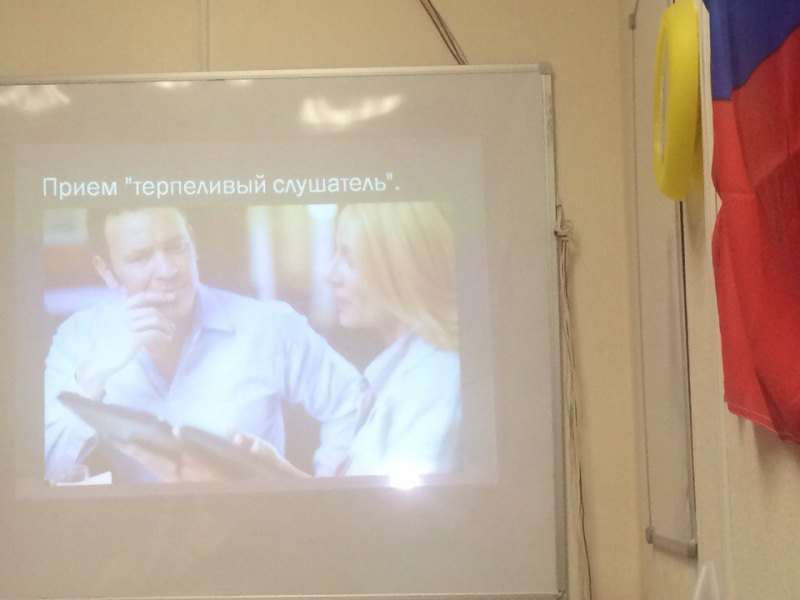 «Мастер-класс «Речевые манипуляции» делился на две лекции: «Приемы воздействия на собеседника» и «Манипуляции в общении». По традиции, мы сначала рассказали нашим посетителям о том, что такое манипуляция, каких видов она бывает, какие приемы воздействия и борьбы с ней. Рассказ сопровождался красочной презентацией. Затем участники прошли тест: мы показывали на экране фотографии людей, лица которых выражали ту или иную эмоцию, а вот какую – должны были угадать слушатели.