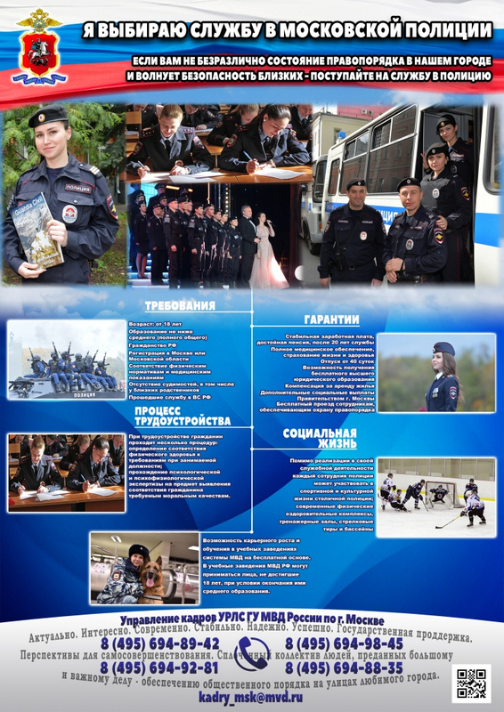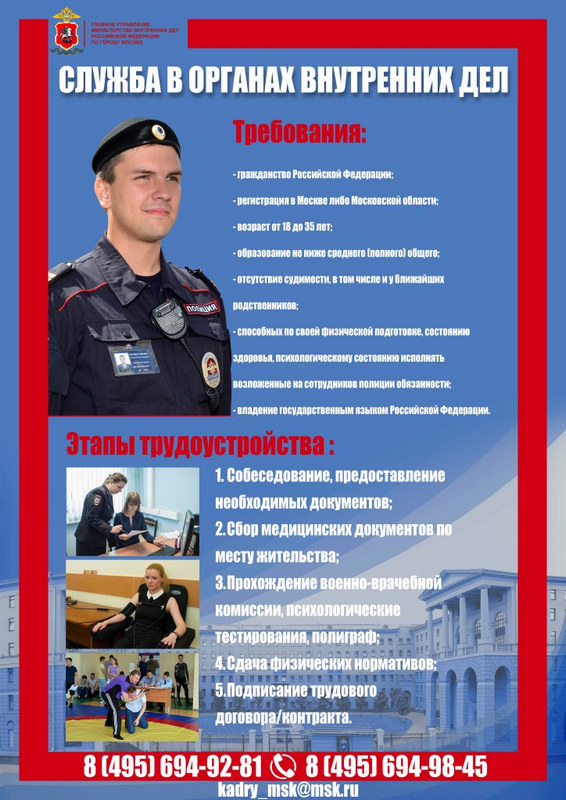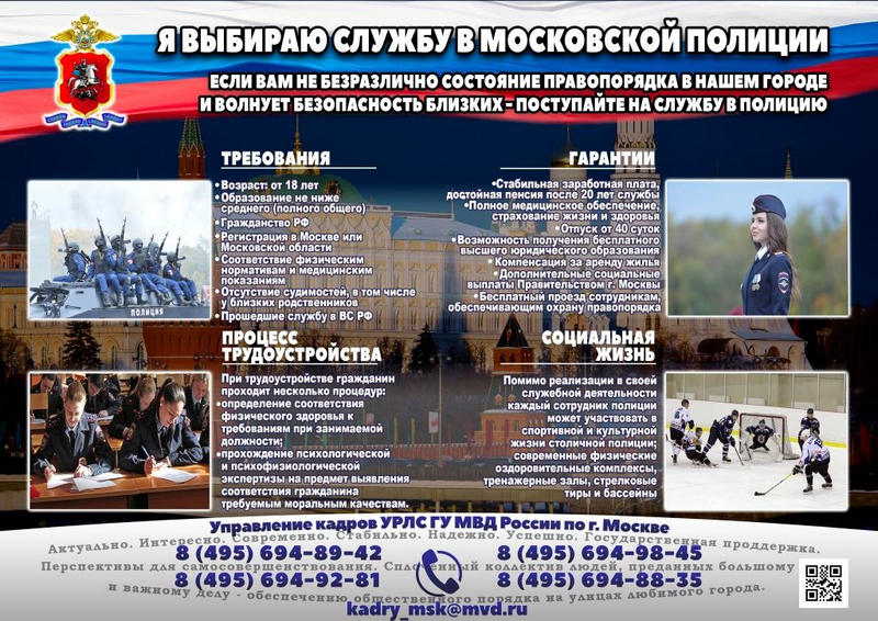 ГУ МВД России по г. Москве приглашает на службу в полицию граждан РФ от 18 до 35 лет, имеющих регистрацию в столице или Подмосковье и годных по состоянию здоровья.