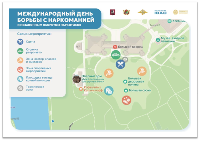 21 июня 2025 года на территории ГМЗ «Царицыно» (на площадке «Большая поляна») Управлением по контролю за оборотом наркотиков  ГУ МВД России по г.Москве, при поддержке Префектуры Южного административного округа г.Москвы и ГБУ г.Москвы «ЮГ СТОЛИЦЫ» запланировано проведение мероприятия, приуроченного к Международному дню борьбы с наркоманией.